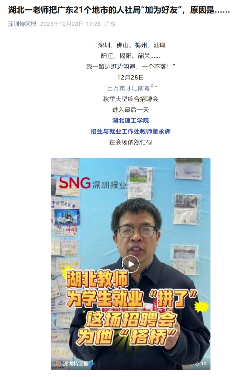 近日,深圳特区报以“湖北一老师把广东21个地市的人社局加为好友,原因是”为题,报道我校招生与就业工作处为学生搭建立体化、精准化的就业对接平台。